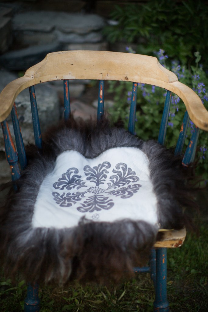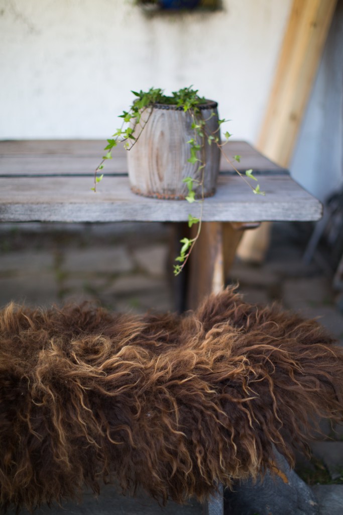 Saueskinna med sitt flotte fargespel (sauer er ikkje bare svarte og kvite!) og mjuke kvalitet. Sauen har varma oss i uminnelege tider, så kvifor ikkje la han ta opp konkuransen med vår tids syntetiske fiber! I tillegg til at skinnfellen