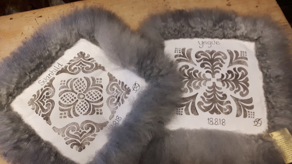 Det som gjer den Norske skinnfellen spesiell er ikkje bare dei vakre skinna og saumteknikken, men dekoren på hudflata. Skinnfellane har bilete og symbol som blir til praktfulle mønster, alle forskjellige. Symbola trykker me med trestempel som er kopiert frå gamle saueskinnsfellar frå Hjartdal kommune, mest frå Tuddal. Alle trykka er teikna av og skorne ut for hand, og alt er handsaum.