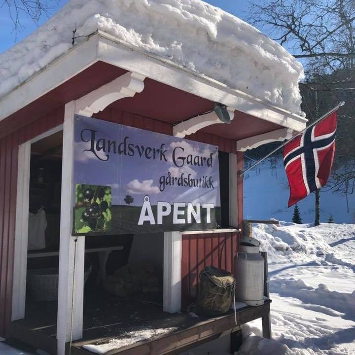 Gårdsbutikk med interiør, diverse lokale matvarer og et sted for å ta seg en kaffekopp.